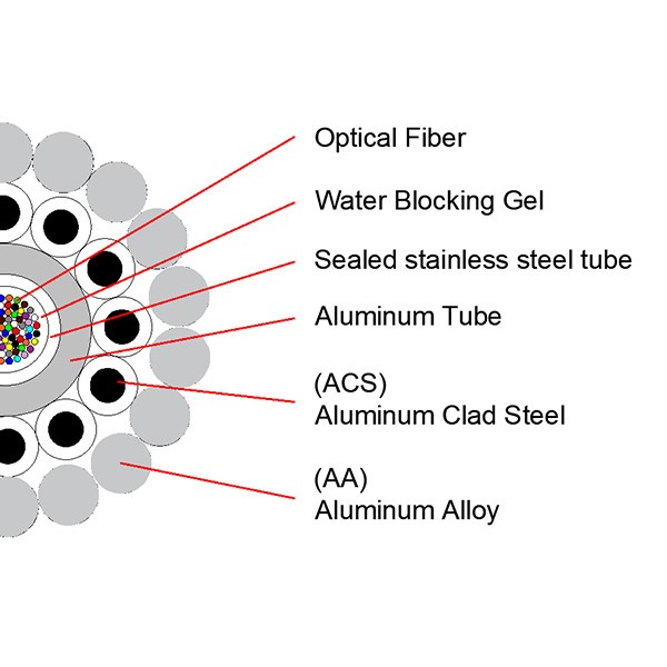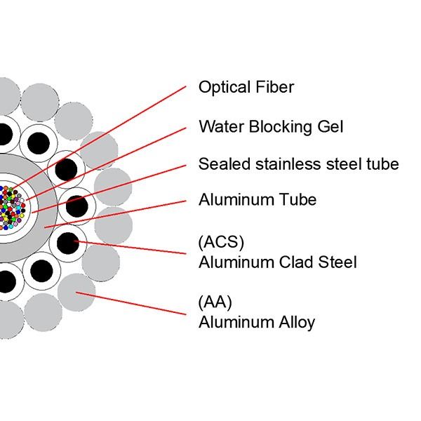 درسیم زمین نوری با رشتهازدو یا سه لایه سیم های فولادی آلومینیومییا ترکیبی از ACS وسیم های آلیومینیومی، ارائهقدرت مکانیکی، دوام و عملکرد الکتریکیطراحی استاندارد دارای یکلوله مرکزی فولاد ضد زنگ که فیبر نوری را در آن قرار می دهد، پوشش داده شده با آلومینیوم برای حفاظت بیشتر.